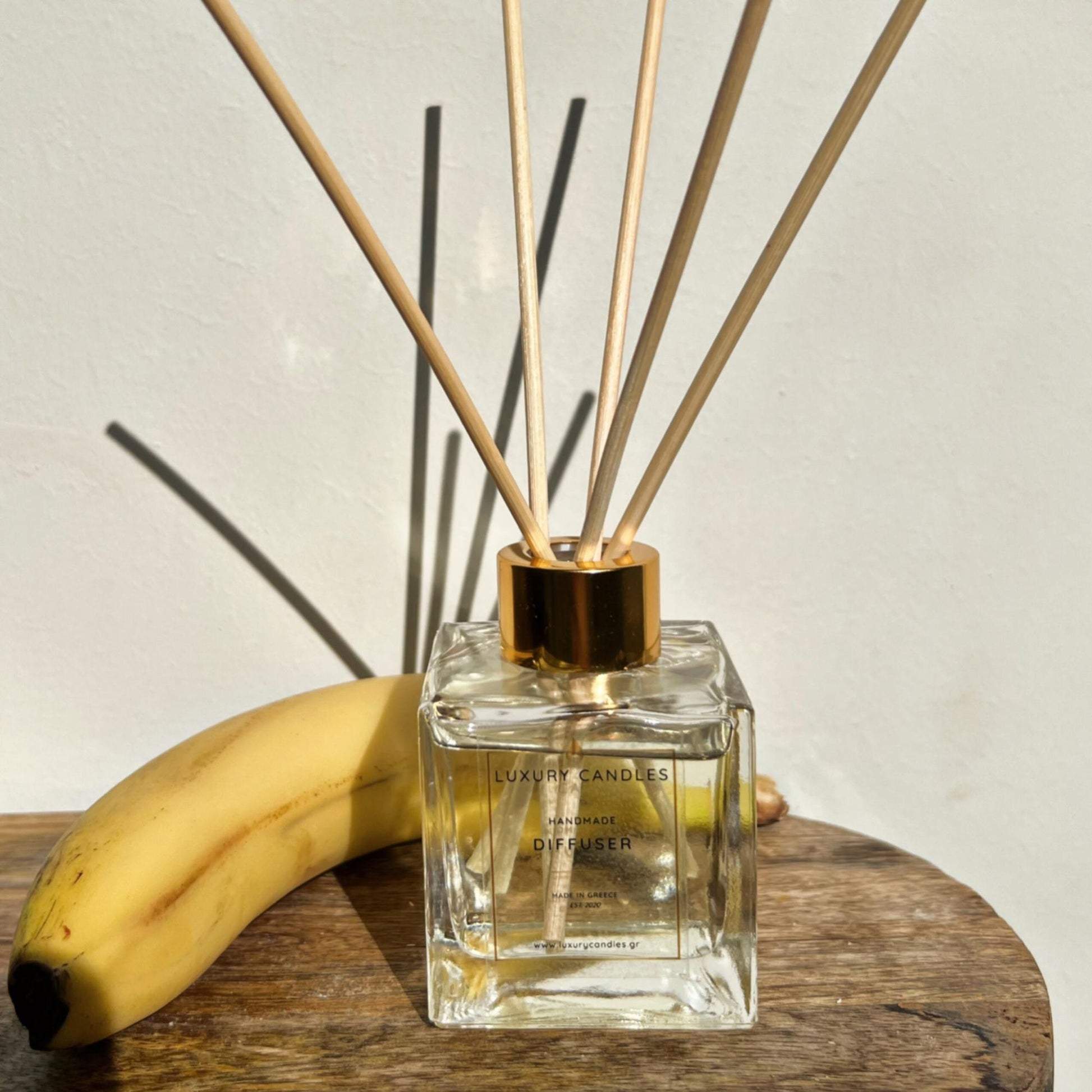 Reed diffuser: heerlijke combinatie van Banaan, tonen van vanille, room en koekjes.